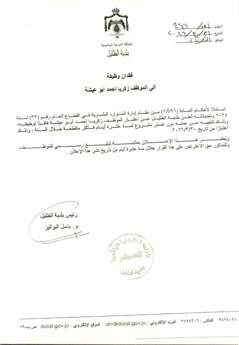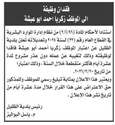 استنادا لأحكام المادة (96/أ/2) من نظام ادارة الموارد البشرية في القطاع العام رقم (33) لسنة 2024 وتعديلاته ، تعلن بلدية الظليل عن اعتبار الموظف زكريا احمد ابو عيشة فاقدا لوظيفته ، وذلك لتغيبه عن عمله دون عذر مشروع لمدة عشرة ايام فأكثر متقطعه خلال السنة وذلك اعتبارا من تاريخ 30/ 3/2026