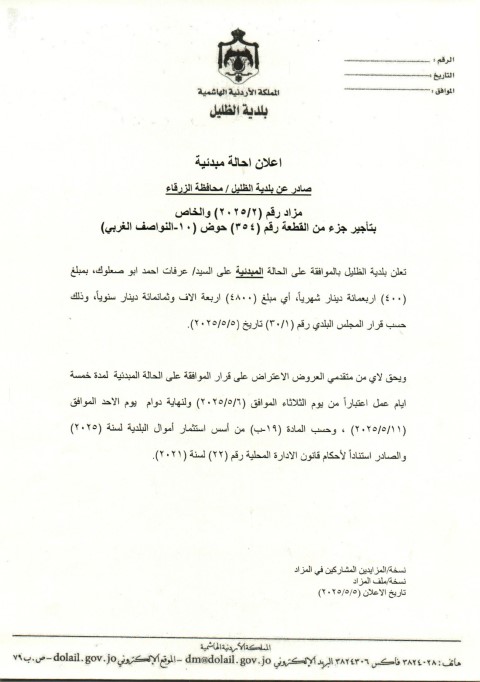 اعلان بيع للمرة الثانية – صادر عن بلدية الظليل / محافظة الزرقاء